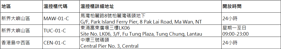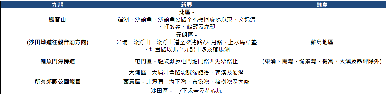 - 香港島、九龍、新界及部分離島地區 (包括東涌、馬灣、愉景灣及南大嶼山)